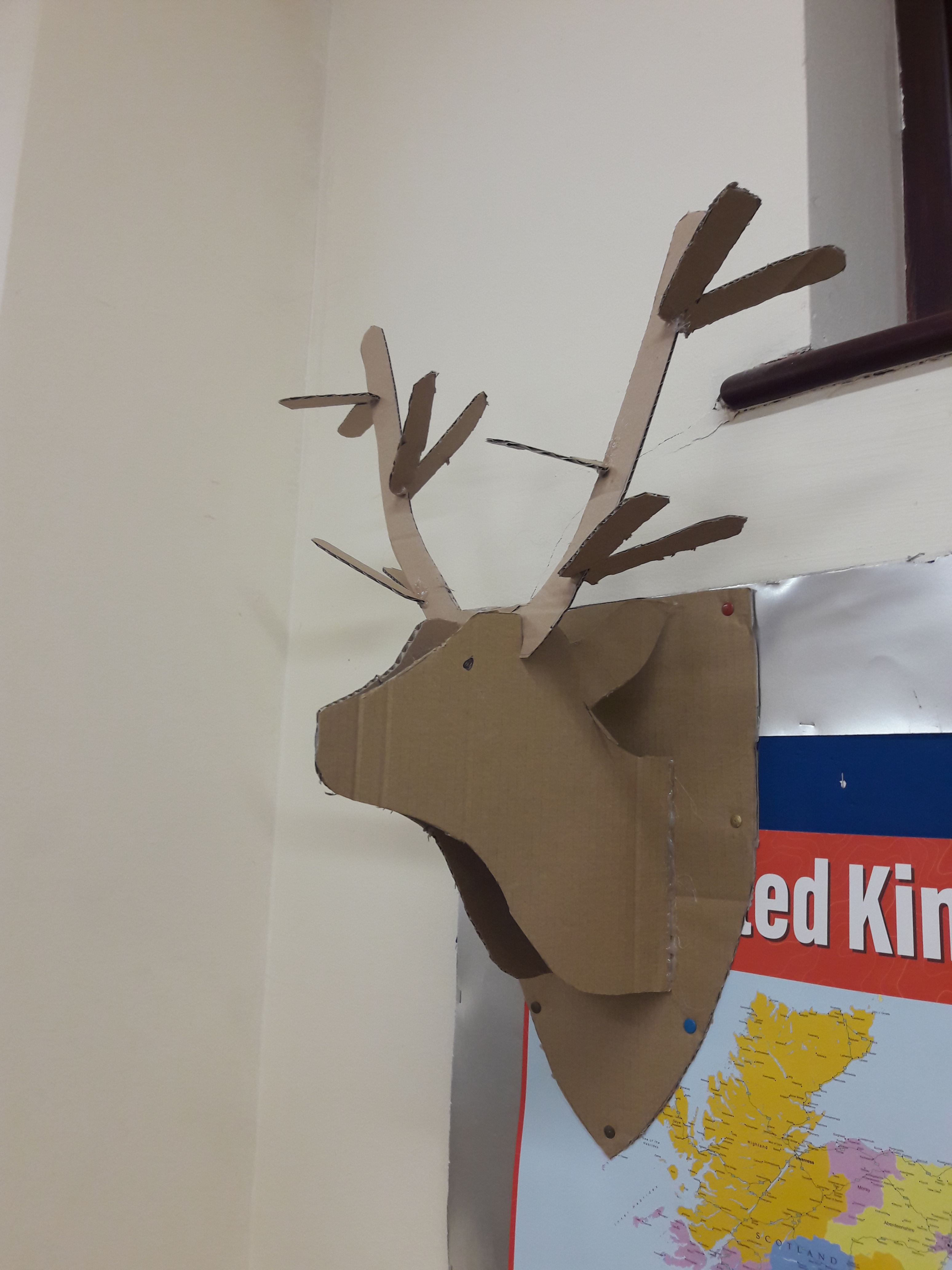 Finally, at the fire exit end of the hall, Jim had an ongoing project of making some reindeer out of cardboard. It involved first cutting out cardboard from a few templates and then using tape and a hot glue gun to fix the pieces together. Jim gave no assistance apart from the overlooking of safety.