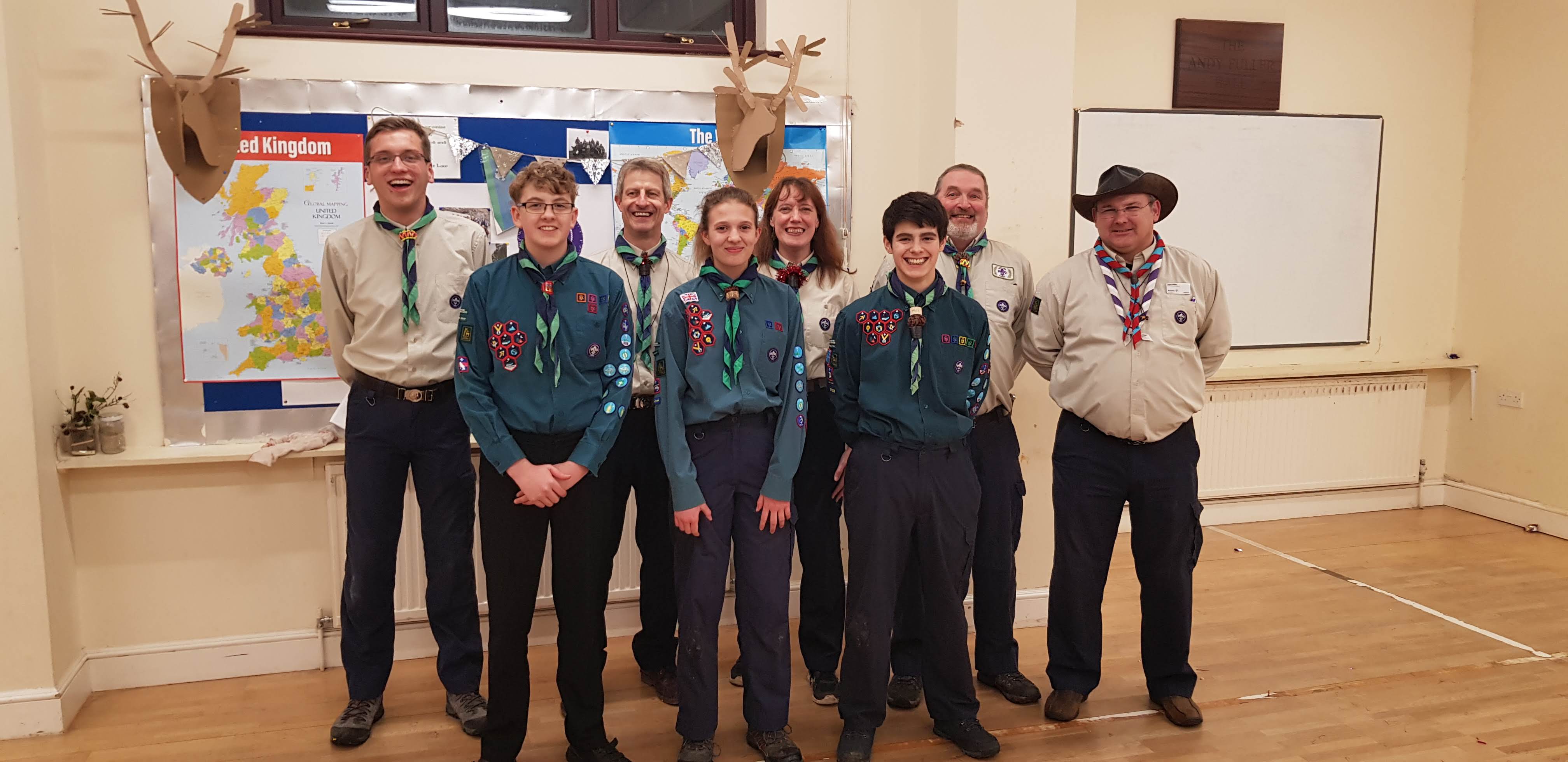 This evening we were very glad to welcome Pang Valley District Commissioner Grant to present something very special to 3 of our Scouts. That doesn’t excuse the standard proceeds of an evening. This is what happened when Chieftain got together to do some carols.